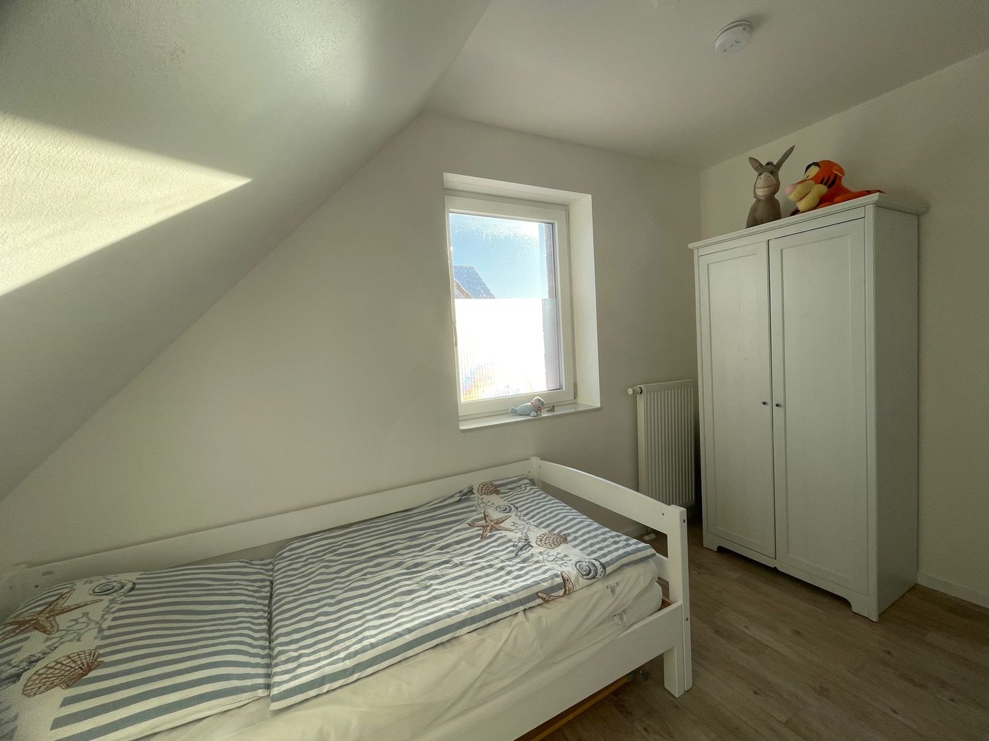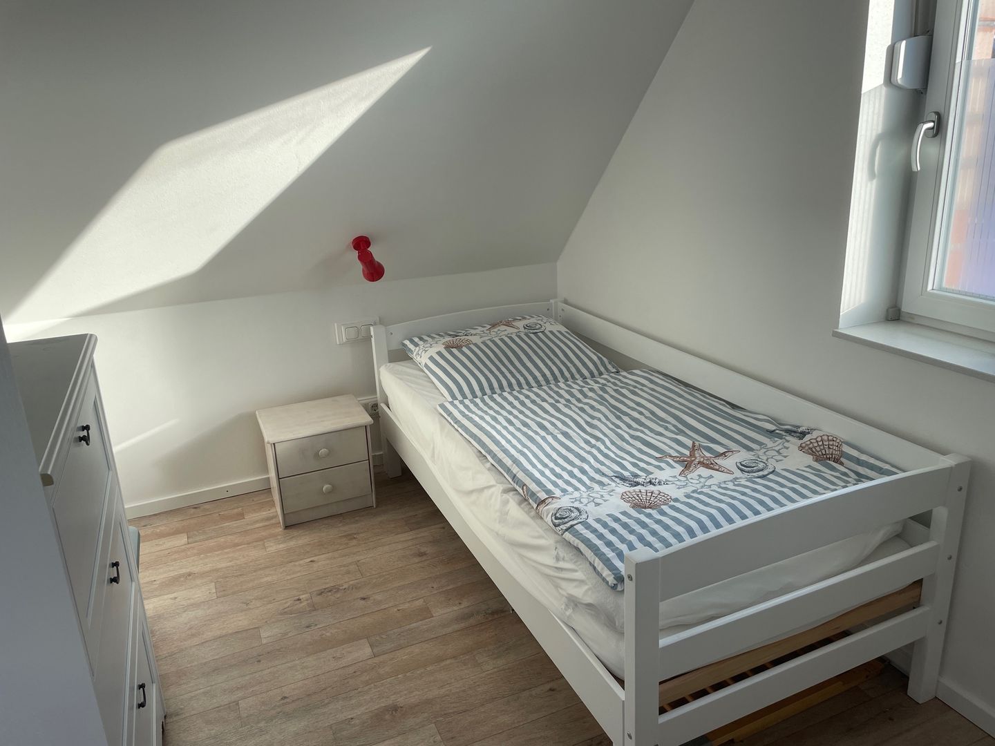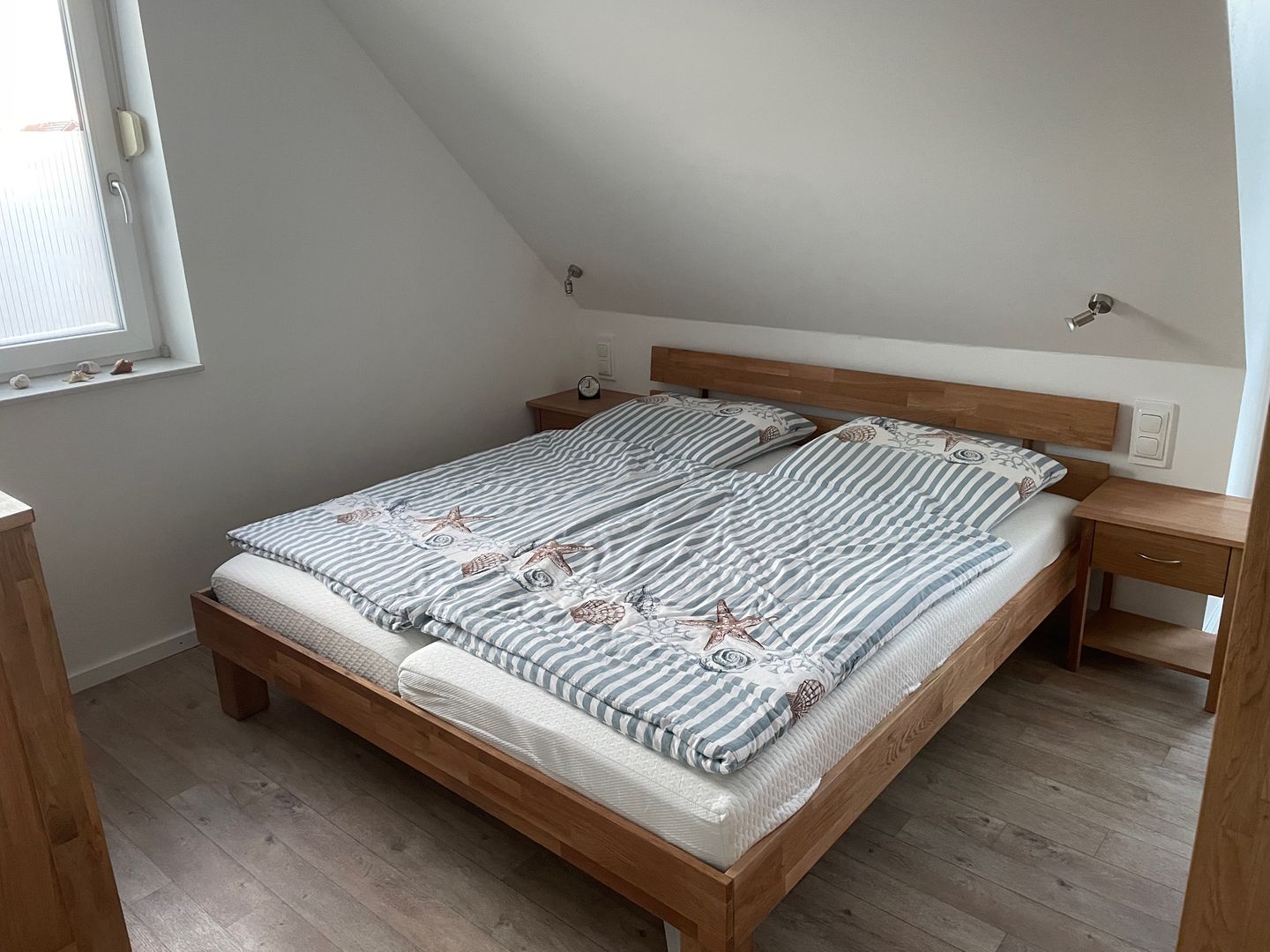 Insgesamt verfügt das Haus über drei gemütliche Schlafzimmer, die Ihnen einen erholsamen Schlaf bieten. Im ersten Schlafzimmer im Obergeschoss erwartet Sie ein komfortables Doppelbett mit einer Größe von 1,80 m. Hier finden Sie auch einen geräumigen Kleiderschrank und eine Außenjalousie, die Ihnen den Raum nach Bedarf abdunkeln lässt. Das zweite Schlafzimmer bietet ebenfalls ein großes Doppelbett und die gleichen Annehmlichkeiten wie das erste. Im dritten Schlafzimmer steht Ihnen ein Einzelbett zur Verfügung, das bei Bedarf zu einem Doppelbett erweitert werden kann. Eine Kommode und eine Außenjalousie runden die Ausstattung ab.